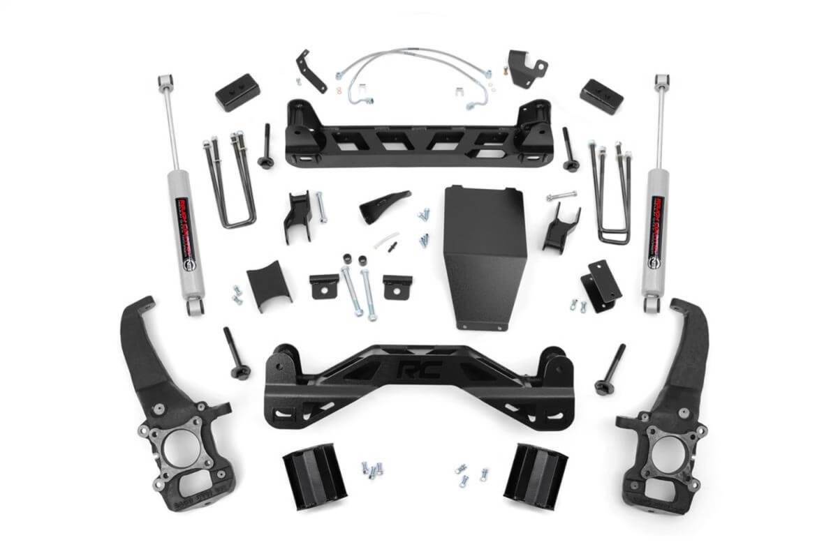 Give your 04-08 Ford F-150 an aggressive new look and unparalleled off-road performance with Rough Countrys 4-inch Suspension Lift. This all-inclusive kit features everything needed to take your Ford off the freeway and onto the trails. Featuring a set of durable lifted knuckles and strut spacers, youll gain enough ride height to run up to 35-inch tires with proper wheel backspacing! A set of differential drop brackets, sway-bar drop brackets, brake line brackets, and a drive shaft spacer help keep everything at optimum angles for a factory-like ride, even after lifting. A 1/4-inch thick plate steel front and rear crossmember bring uncompromising strength and good looks to your truck. A set of Rough Countrys premium N3 shocks are also included in this kit. These fine tuned 10-stage variable high-pressure Nitrogen charged shocks offer a fantastic blend of off-road action and smooth highway ride quality. With a durable 18mm spring-loaded piston rod and faster-cooling 54mm shock body. Best of all, Rough Countrys 04-08 Ford F-150 Lift Kit is backed by our Lifetime Replacement Warranty.
