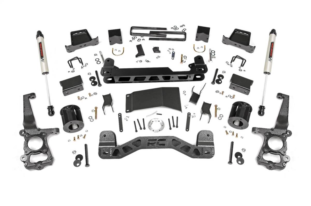 Give your Ford F-150 an aggressive new look and unparalleled off-road performance with Rough Countrys 6-inch Suspension Lift. This all-inclusive kit features everything needed to take your Ford off the freeway and into the fields.Featuring a set of durable lifted knuckles and strut spacers, youll gain enough ride height to run up to 35-inch tires with proper wheel spacing! A set of differential drop brackets, sway-bar drop brackets, brake line brackets, and a drive shaft spacer help keep everything at optimum angles for a factory-like ride, even after lifting. A 1/4-inch thick plate steel front and rear crossmember bring uncompromised strength and good looks to your truck, and are updated to fit the new F-150 design. Our Fabricated Rear Blocks offer considerably more strength than their cast iron counterparts, and were specifically engineered by Rough Country to prevent against axle-wrap. A set of Rough Countrys premium N3 shocks are also included in this kit, featuring a large diameter body with a chrome-hardened piston rod and long-lasting polyurethane bushings.Best of all, Rough Countrys Ford F-150 Lift Kit is backed by our Lifetime Replacement Warranty.
