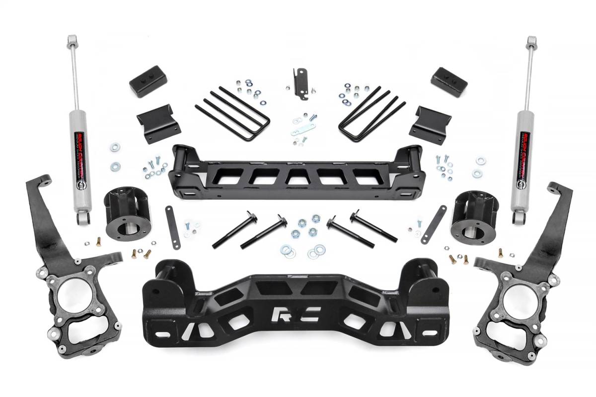 Give your 2WD Ford F-150 an aggressive new look and unparalleled off-road performance with Rough Countrys 4-inch Suspension Lift. This all-inclusive kit features everything needed to take your Ford off the freeway and into the fields. Featuring a set of durable lifted knuckles and strut spacers, youll gain enough ride height to run up to 33-inch tires! A 1/4-inch thick plate steel high clearance front and rear cross member bring uncompromised strength and good looks to your truck, featuring a laser-cut in.RC in. logo and an easy-to-install design. Our Fabricated Rear Blocks offer considerably more strength than their cast iron counterparts, and were specifically engineered by Rough Country to prevent against axle-wrap. A set of Rough Countrys premiere off-road shock absorbers are also included in this kit. No cutting or drilling required to install, and best of all this kit is backed by Rough Countrys Lifetime Replacement Warranty!
