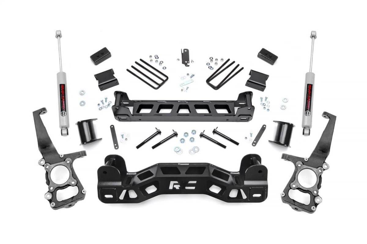 Give your 2WD Ford F-150 an aggressive new look and unparalleled off-road performance with Rough Countrys 4-inch Suspension Lift. This all-inclusive kit features everything needed to take your Ford off the freeway and into the fields. Featuring a set of durable lifted knuckles and strut spacers, youll gain enough ride height to run up to 33-inch tires! A 1/4-inch thick plate steel high clearance front and rear cross member bring uncompromised strength and good looks to your truck, featuring a laser-cut in.RC in. logo and an easy-to-install design. Our Fabricated Rear Blocks offer considerably more strength than their cast iron counterparts, and were specifically engineered by Rough Country to prevent against axle-wrap. A set of Rough Countrys premiere off-road shock absorbers are also included in this kit. No cutting or drilling required to install, and best of all this kit is backed by Rough Countrys Lifetime Replacement Warranty!