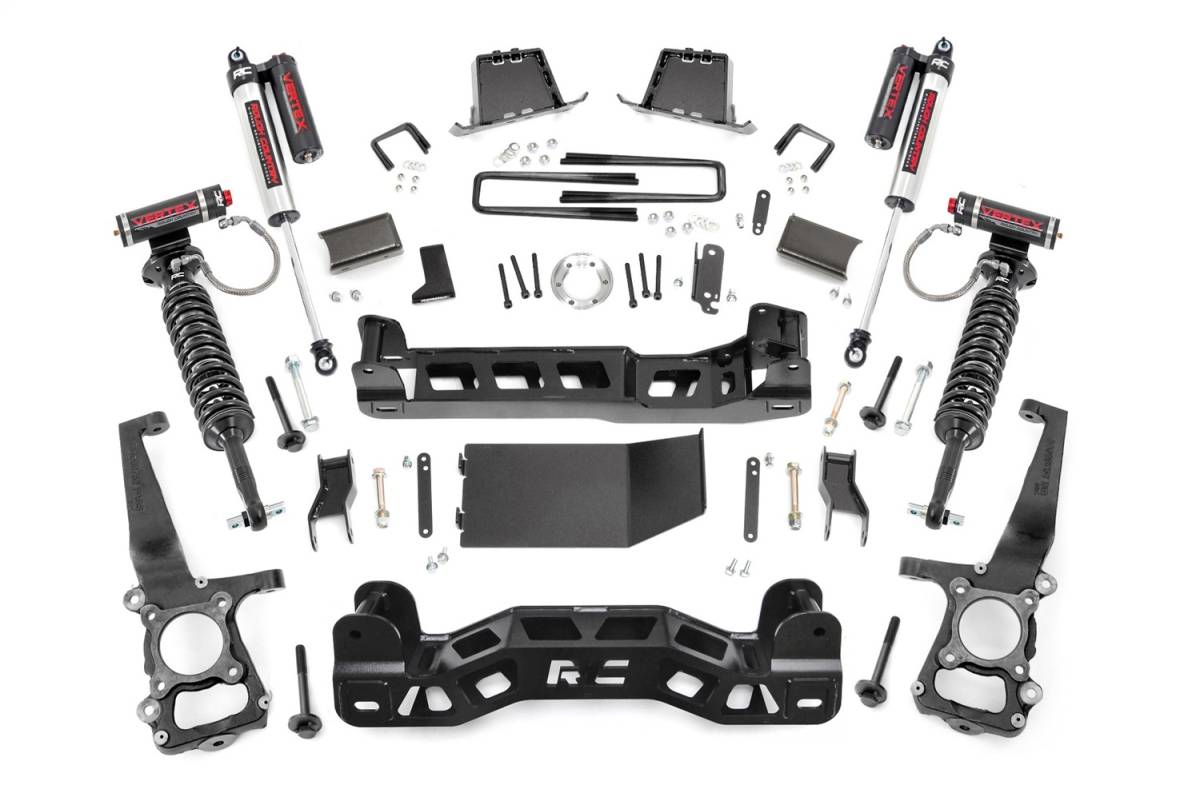 Give your 11 - 13 Ford F-150 an aggressive new look and unparalleled off-road performance with Rough Countrys 6-inch Suspension Lift. This all-inclusive kit features everything needed to take your Ford off the freeway and into the fields. Featuring a set of durable lifted knuckles and N3 lifted struts, youll gain enough ride height to run up to 35-inch tires! A set of differential drop brackets, sway-bar drop brackets, brake line brackets, and a drive shaft spacer help keep everything at an optimum angle for a factory-like ride, even after lifting. A 1/4-inch thick plate steel front and rear cross member bring uncompromised strength and good looks to your truck, featuring a laser-cut "RC" logo and an easy-to-install design. Our 4-inch Fabricated Rear Blocks offer considerably more strength than their cast iron counterparts, and were specifically engineered by Rough Country to prevent against axle-wrap. A set of Rough Countrys premiere off-road shock absorbers - N3 - are also included in this kit, featuring a large diameter body with a chrome-hardened piston rod and long-lasting polyurethane bushings.