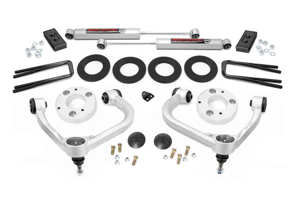 Rough Countrys 3in Bolt-On Kit offers easy installation and aggressive good looks at an incredible value. Take your truck to new heights with this excellent option for F-150 pickups. This kit features a set of high-quality, Forged 6082-6 Aluminum Upper Control Arms designed to make alignment adjustments easier and Clevite rubber bushings for enhanced durability. These arms are designed to promote a factory-like geometry by keeping the ball joint at optimum angles after lifting. This design allows for an improved, greater range of motion from the ball-joint, with less stress, wear and tear. Also included are a set of rear blocks to provide lift height in the rear. Once installed, this kit gives your truck plenty of ride height for up to 34in tires while offering a clean, level look from front to rear. Retain your stock wheels with this kit when you use Rough Countrys 0.25-inch wheel spacer. This all-inclusive kit comes with everything you need, and installation is a piece of cake compared to other kits on the market! Featuring a 100% bolt-on installation process that requires zero cutting or drilling, this kit can be installed using common tools in a home garage and allows the truck to be returned to stock at any time if so desired. Best of all this kit features Rough Countrys Lifetime Replacement Warranty.