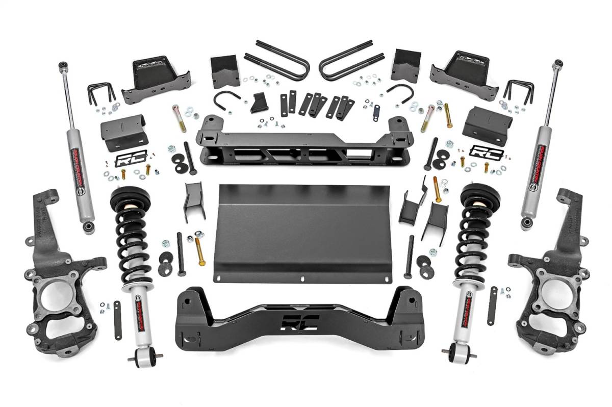 Give your 2021 Ford F-150 an aggressive new look and unparalleled off-road performance with Rough Country's 6-inch Suspension Lift. This all-inclusive kit features everything needed to take your Ford off the freeway and into the fields.Featuring a set of durable lifted knuckles and strut spacers, you'll gain enough ride height to run up to 35-inch tires with proper wheel spacing! A set of differential drop brackets, sway-bar drop brackets, brake line brackets, and a drive shaft spacer help keep everything at optimum angles for a factory-like ride, even after lifting. A 1/4-inch thick plate steel front and rear crossmember bring uncompromised strength and good looks to your truck, and are updated to fit the new F-150 design. Our Fabricated Rear Blocks offer considerably more strength than their cast iron counterparts, and were specifically engineered by Rough Country to prevent against axle-wrap.A set of Rough Country's premium N3 shocks are also included in this kit, featuring a large diameter body with a chrome-hardened piston rod and long-lasting polyurethane bushings.Best of all, Rough Country's Ford F-150 Lift Kit is backed by our Lifetime Replacement Warranty.