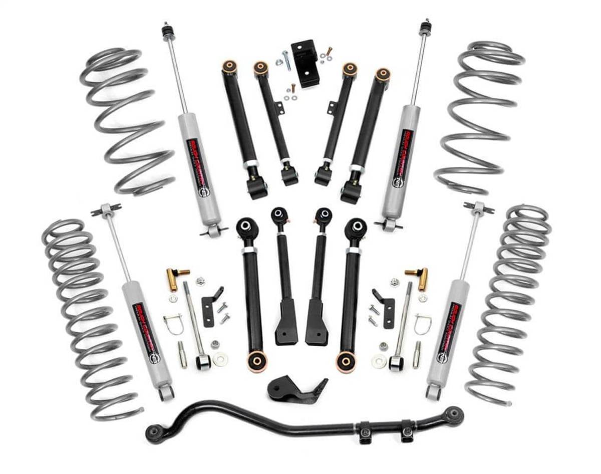Venture far beyond the limits of a stock Wrangler with Rough Countrys all-inclusive 2.5-inch X-Series Lift for Jeep TJ. Level the front of your vehicle with the rear while gaining enough increased ground clearance to run up to 33-inch tires. Rough Countrys X-Series line represents the best-in-class equipment for off-road action, including fully rebuildable X-Flex Adjustable Control Arms, Clevite Rubber Bushings, Sway-bar quick disconnects, and your choice of our N3 shocks for daily drivers or our oversized Performance 2.2s for optimum off-road performance. For those who are serious about flexing, crawling, and pushing your Jeep to the limits, this kit features an upgraded Forged Adjustable Track Bar. Made of forged steel, this 16lb Track Bar boasts a beefy construction that will dwarf stock equipment. Easy to install and fully adjustable on the vehicle.