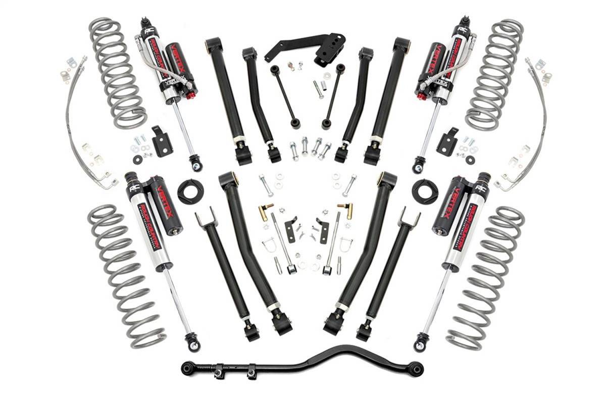 Give your Jeep a total transformation with Rough Countrys 4in X-Series Suspension Lift. This all-inclusive kit comes with everything you need to give your vehicle aggressive good looks and improved off-road performance!This kit features a set of front and rear upper and lower adjustable control arms with a high-clearance design, allowing you to dial in the exact ride you desire! Each kit also comes with lifted coil springs and coil correction plates, providing lift height and impeccable vibration dampening on any terrain.For those who are serious about flexing, crawling, and pushing your Jeep to the limits, this kit features an upgraded Forged Adjustable Track Bar. Made of forged steel, this 16lb Track Bar boast a beefy construction that will dwarf stock equipment. Easy to install and fully adjustable on the vehicle.Best of all, this kit features Rough Countrys premium N3 shocks! These 10-stage variable valving, high-pressure Nitrogen charged shocks offer a fantastic blend of off-road action and smooth highway ride quality. With a durable 18mm spring-loaded piston rod and faster-cooling 54mm shock body, this shock offers up to 36kN Tensile Strength for a long lifespan of impressive vibration dampening. Features natural rubber bushings and an eye-catching metallic silver paint.
