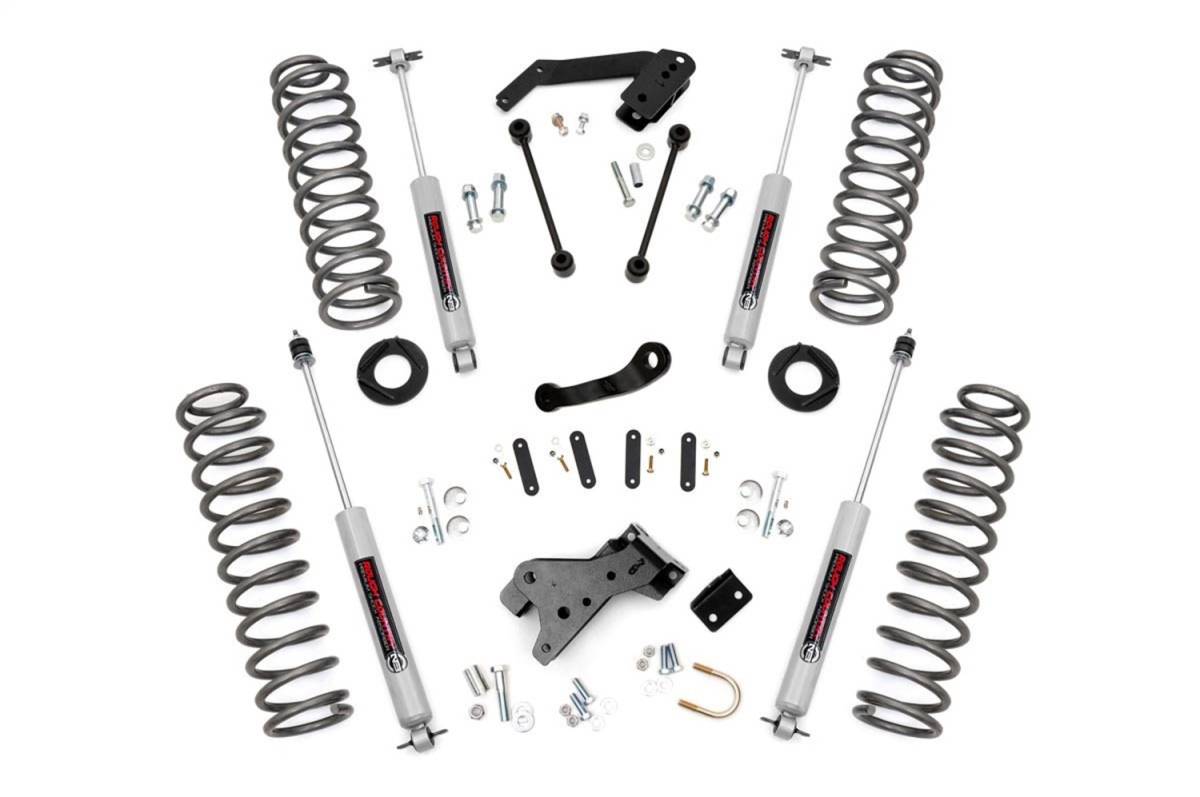 Give your Jeep a total transformation with Rough Countrys 4in Suspension Lift! This all-inclusive kit comes with everything you need to give your vehicle aggressive good looks and improved off-road performance!This kit features lifted coil springs and coil correction plates, providing lift height and impeccable vibration dampening on any terrain. Best of all, this kit features Rough Countrys premium N3 shocks! These 10-stage variable valving, high-pressure Nitrogen charged shocks offer a fantastic blend of off-road action and smooth highway ride quality. With a durable 18mm spring-loaded piston rod and faster-cooling 54mm shock body, this shock offers up to 36kN Tensile Strength for a long lifespan of impressive vibration dampening. Features natural rubber bushings and an eye-catching metallic silver paint.