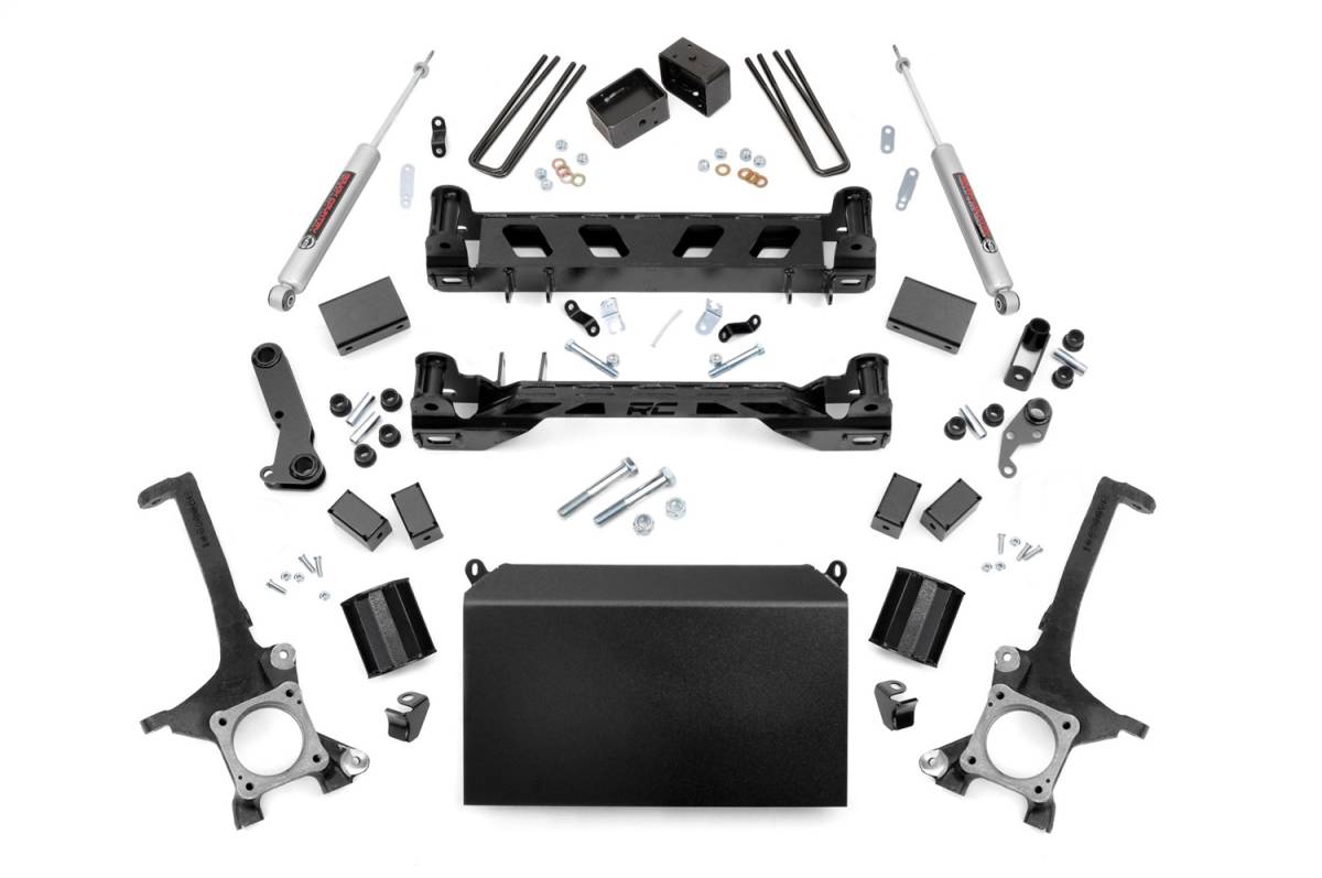 Youll never look at a Tundra the same way after installing Rough Countrys 4-inch Toyota Tundra kit. This all-inclusive kit is a total transformation for your truck, with durable lifted knuckles, protective skid plate, and all the brackets and hardware needed to set your truck to a factory-like geometry while providing additional ground clearance. The beefy front crossmember features a high-clearance design to help traverse off-road obstacles with no hang-ups.Run larger wheels and tires while giving your truck a one-of-a-kind look and exceptional off-road performance. This kit affords your truck an aggressive appearance and a higher profile that is sure to demand attention. This kit includes Rough Countrys Nitrogen-charged N3 Shocks for the ultimate balance in highway ride quality and off-road vibration dampening. Includes Rough Countrys Lifetime Replacement Guarantee.
