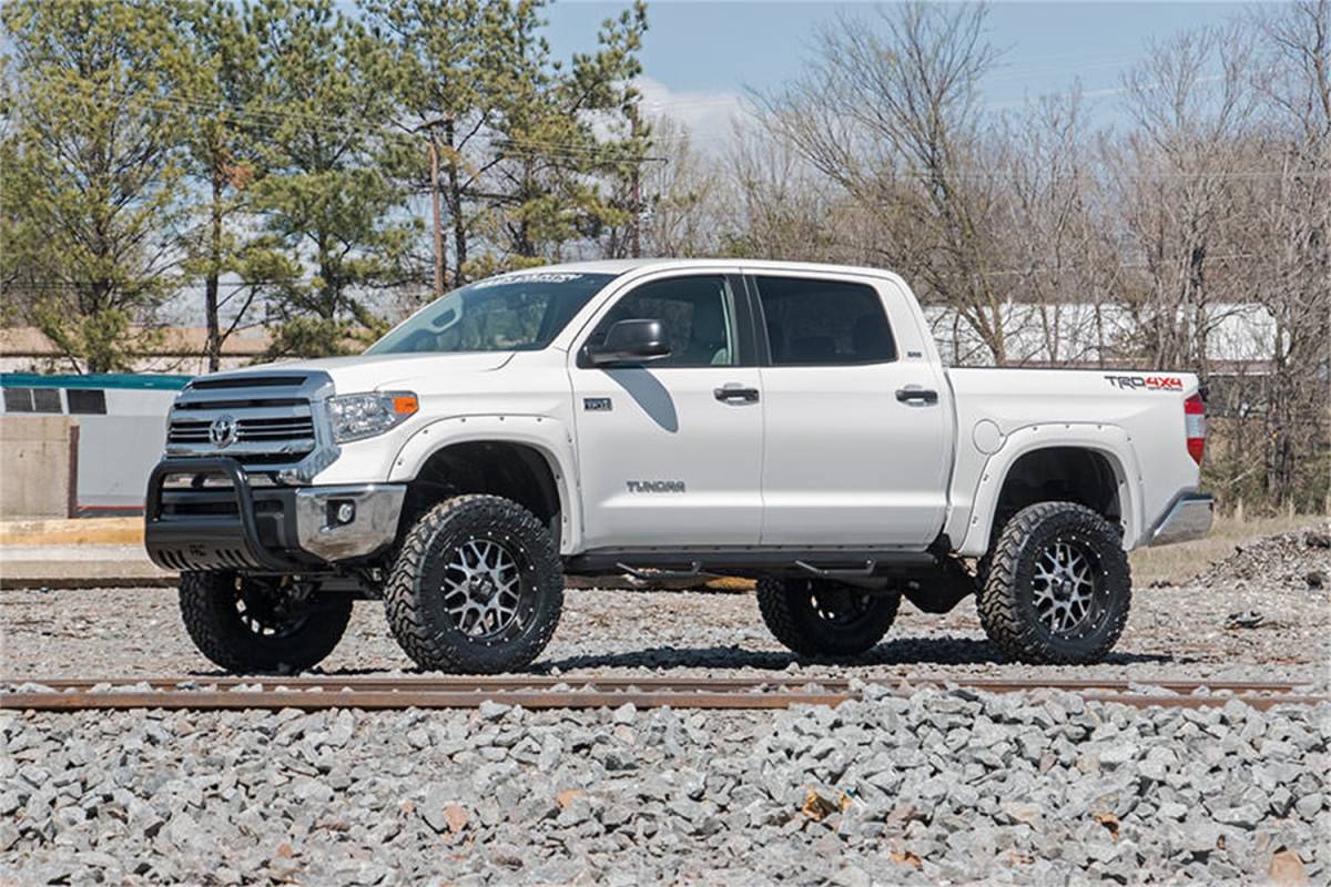 Youll never look at a Tundra the same way after installing Rough Countrys 6-inch Toyota Tundra kit. This all-inclusive kit is a total transformation for your truck, with durable lifted knuckles, protective skid plate, and all the brackets and hardware needed to set your truck to a factory-like geometry while providing additional ground clearance. The beefy front crossmember features a high-clearance design to help traverse off-road obstacles with no hang-ups.Run larger wheels and tires while giving your truck a one-of-a-kind look and exceptional off-road performance. This kit affords your truck an aggressive appearance and a higher profile that is sure to demand attention. This kit includes Rough Countrys Adjustable Reservoir V2 Shocks for the ultimate balance in highway ride quality and off-road vibration dampening. Includes Rough Countrys Lifetime Replacement Guarantee.