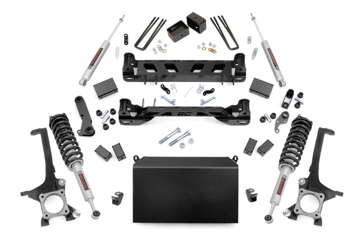 Take your Toyota Tundra to the next level with Rough Countrys 4.5in Suspension Lift for 07 and up models. With heavy-duty components and a high-clearance design, this kit offers aggressive looks, unparalleled off-road performance, and enough ride height to run up to 35in tires.Instantly gain a meaner lifted and level stance with high-quality equipment thats made to handle the hazards of high-performance while withstanding the test of time. A set of durable lifted knuckles, high-clearance front and rear crossmembers, N3 loaded struts, and long-lasting, fabricated rear blocks give you plenty of lift and uncompromised toughness.This all-inclusive kit features everything you need to take your Tundra off the tread and through the trenches; featuring steering stops, brake line brackets, differential drop brackets, sway-bar drop brackets, and anything else one would need to keep everything working at optimum angles after lifting. Best of all, you can get up and running with Rough Countrys 4.5in Toyota Tundra Lift at a price that wont break the bank!