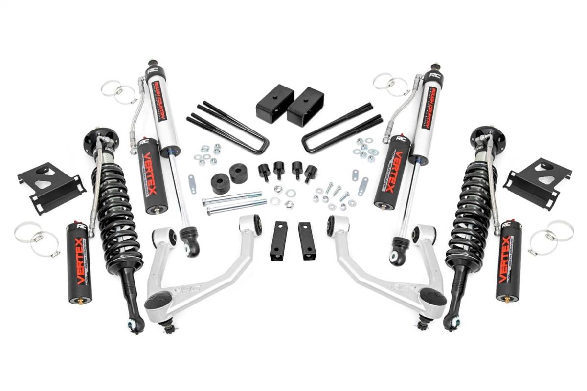 Rough Countrys 3.5in Bolt-On Kit offers easy installation and aggressive good looks at an incredible value. Take your truck to new heights with this excellent option for 07-17 Tundra pickups.This kit features a set of high-quality, tubular Upper Control Arms designed to make alignment adjustments easier and Clevite rubber bushings for enhanced durability. These arms are designed to promote a factory-like geometry by keeping the ball joint at optimum angles after lifting. This design allows for an improved, greater range of motion from the ball-joint, with less stress, wear and tear.Rough Countrys 3.5-inch Bolt-On Kit features V2 Monotube Nitrogen-charged shocks, giving your truck incredible ride-quality both on and off-road. Also included are a set of durable loaded struts and fabricated rear blocks to provide lift height from front to rear. Once installed, this kit gives your truck plenty of ride height for larger tires while offering a clean, level look from front to rear.This all-inclusive kit comes with everything you need, and installation is a piece of cake compared to other kits on the market! Featuring a 100% bolt-on installation process that requires zero cutting or drilling, this kit can be installed using common tools in a home garage, and allows the truck to be returned to stock at any time if so desired. Best of all this kit features Rough Countrys Lifetime Replacement Warranty.