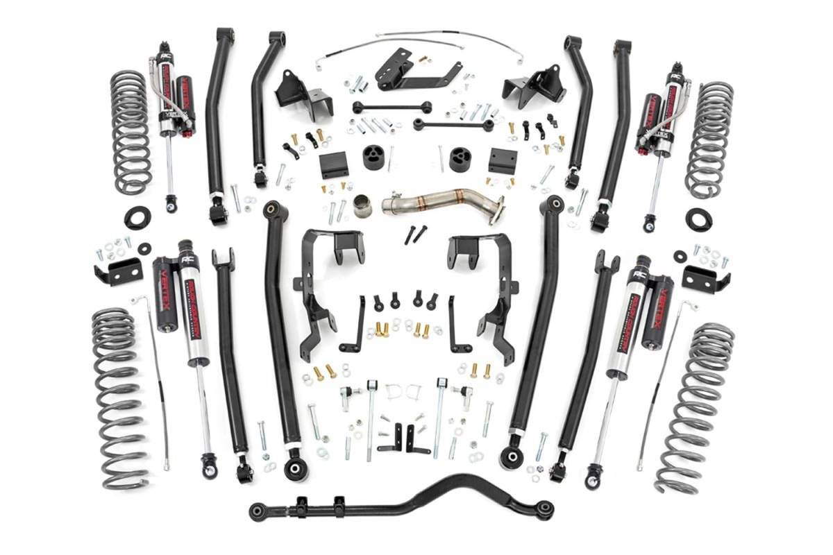 Achieve the ultimate flex and articulation while retaining a smooth highway ride quality with Rough Country;s 4in Long Arm Suspension Lift Kit. This true 4-link setup offers incredible off-road performance while keeping the suspension geometry as close to the factory angles as possible. The result is a freer, more capable suspension setup that can deliver jaw-dropping rock crawling performance while still giving the soft, lush highway ride quality a daily driver would enjoy.Rough Countrys 4in Long Arm Suspension Lift features custom engineered dual-rate coils that provide two distinctly different levels of compression allowing you to tackle any obstacle with ease. Each kit includes a full set of Rough Countrys Nitrogen-charged N3 shocks, designed to offer the maximum possible travel while providing a lush ride.The 4-link setup includes a full set of front and rear upper and lower adjustable control arms giving you full control to adjust the wheelbase and pinion angle. Each arm features Rough Countrys adjustable flex joints with Clevite rubber bushings and is constructed out of durable heavy-wall DOM tubing for a long lifespan of flex and performance. All brackets are made of a thick 1/4in thick high tensile strength plate steel.Rough Countrys 4in kit boasts an easier install process than most long arm kits, with no welding and no removal of the factory crossmember required for installation. The kit also includes extended stainless steel brake lines and coil correction plates making it that much faster and easier to install. Includes a Lifetime Replacement Guarantee!