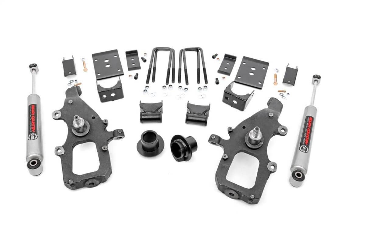 How low will you go? Give your F-150 a total transformation with Rough Countrys 3in/5in lowering Kit for 04-08 Ford F-150 2WD Trucks! This all-inclusive lowering kit comes with everything you need for a sleek, street-cruising monster thats sure to turn heads.A set of sturdy Driver and Passenger Lowering Spindles offer plenty of drop while helping maintain a factory-like ride. Also included are a set of rear Lowering Shackles, Drop Spring Seats, and Upper and Lower Spring Plates. Unlike most lowering kits, this package supplements the rear suspension with our premium N2.0 shock absorbers. All together, this kit drops the ride height of your F-150 by 3-inches in the front and 5-inches in the rear, offering a sleek-looking drop while keeping other crucial components in line. Best of all, this 3in/5in Ford F-150 lowering kit features Rough Countrys Lifetime Replacement Warranty!