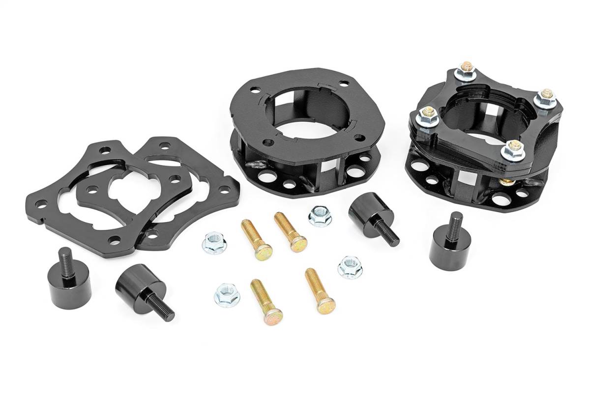 Rough Countrys 2.5 in. - 3 in. Leveling Suspension Kit for Toyota Tundra is the most innovative way for you to level the front of your vehicle with the rear, allowing you to dial in the angle you desire. Featuring a set of front, upper strut extensions, this kit can accommodate up to a 33 in. tire. This kit now includes two sets of 0.25 in. spacer shims, which can be used in addition to the strut spacers to fine-tune your level angle. Each shim provides roughly 3/8 in. of lift. Use both for a full 3 in. level, or fewer to leave a little rake in the front end angle - this is specifically great for individuals who prefer a slight nose down look for an aggressive head-on view, or routinely pull trailers and haul items that would potentially draw the nose up from a full level stance. Designed by Rough Countrys in-house Research and Development team, these components are engineered for a precise fit and incorporate superbly with factory equipment. 100 % bolt-on installation makes setup a breeze, and all components are protected by Rough Countrys Lifetime Replacement Warranty.