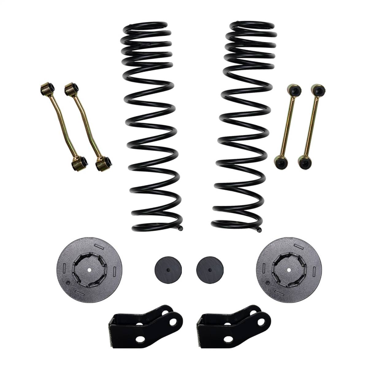 Your unmistakably Jeep Gladiator JT Rubicon is a rugged utility vehicle that yearns for exploration and adventure. Enjoy wide-open freedom by going bigger in a better way with this cost-effective coil spring front / spacer rear option. Get better approach angles, middle break-over angles and rear departure angles with more aggressive 37s. The key to gaining lift height and keeping your stock-like ride is Skyjacker's coil springs. Skyjacker specifically engineered a progressive variable rate coil spring, distinctively a 2-stage dual rate long travel coil. Spring rate progression is from a 1st Flex Rate to a 2nd Ride Rate. The 1st Flex Rate stage of the coil spring delivers a comfortable ride with the ability to flex for increased articulation. The coil spring flex rate expands during full articulation as the suspension drops (full droop). This keeps the coils spring seated in the upper coil mount/bucket and the tires in contact with the terrain. The 2nd Ride Rate stage only engages after compression past the flex rate. This 2nd Ride Rate gives optimal performance and consistent controlled stability during body roll and aggressive off-road suspension movement. The strong tab and slot interlocked integrity of the Rear 1-Piece Coil Spring Spacers raises the rear 1 inch to gain a more level stance and function perfectly with the Jeep Gladiator's factory coil springs. Front 2 Inch Bump Stop Spacers bolt onto the axle bump pad to properly limit the compression stroke. Well-built Front Shock Extension Relocation Brackets reposition your factory shocks. Extended Length Sway Bar End Links allow full articulation as the suspension drops (full droop). The front end links include Skyjacker installed pressed-in HD OEM style rubber bushings. The rear end links come with press-in Poly bushings. Both sets are Zinc plated for corrosion protection. Proper suspension geometry ensures the Electronic Stability Control (ESC) system functions within factory parameters.