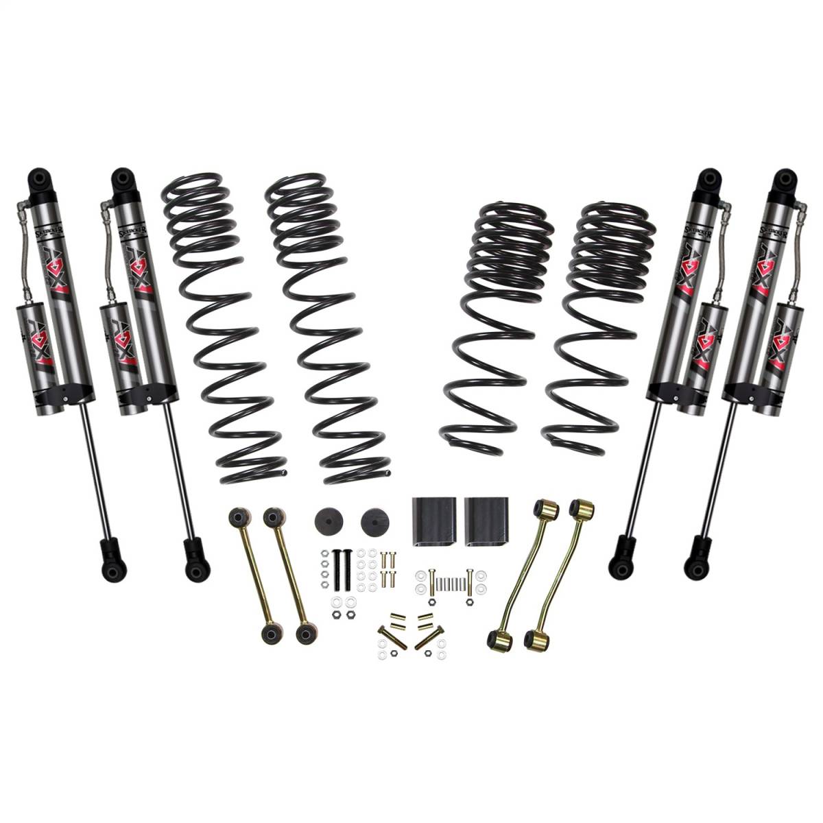 The biggest determining factors in ride quality and suspension performance are coil springs and shocks. Skyjacker specifically engineered a progressive variable rate coil spring, distinctively a 2-stage dual rate long travel coil. Spring rate progression is from a 1st Flex Rate to a 2nd Ride Rate. The 1st Flex Rate stage delivers a comfortable ride with the ability to flex for increased articulation. The flex rate expands during full articulation as the suspension drops (full droop). This keeps the coil springs seated in the upper coil mount/bucket and the tires in contact with the terrain. The 2nd Ride Rate stage only engages after compression past the flex rate. Engineered to coordinate with the Wrangler's distinctive suspension handling characteristics, the rear coils are side specific.Shocks are a key link in-between the chassis and the moving parts of your suspension. Their key role is to optimize your suspension by keeping your tires in contact with the terrain. Skyjacker's ADX 2.0 Adventure Series Remote Reservoir Aluminum Monotube Shocks deliver modern technology in the design with an innovative off-road race-inspired full-displaced valving system. Engineered for higher speed applications, remote reservoir shocks still perform at crawl. The external remote reservoir separates the nitrogen gas from the oil with an Internal Floating Piston (IFP). The majority of the reservoir contains pressurized nitrogen gas. The IFP prevents the gas and oil from mixing or foaming (cavitation). Front and Rear Bump Stop Spacers bolt onto the axle bump pads and keep the suspension travel safely in check. Front and Rear Extended Length Sway Bar End Links allow full articulation as the suspension drops (full droop). These sway bar end links include Skyjacker installed pressed-in HD OEM style rubber bushings. Proper suspension geometry ensures the Electronic Stability Control (ESC) system functions within factory parameters.