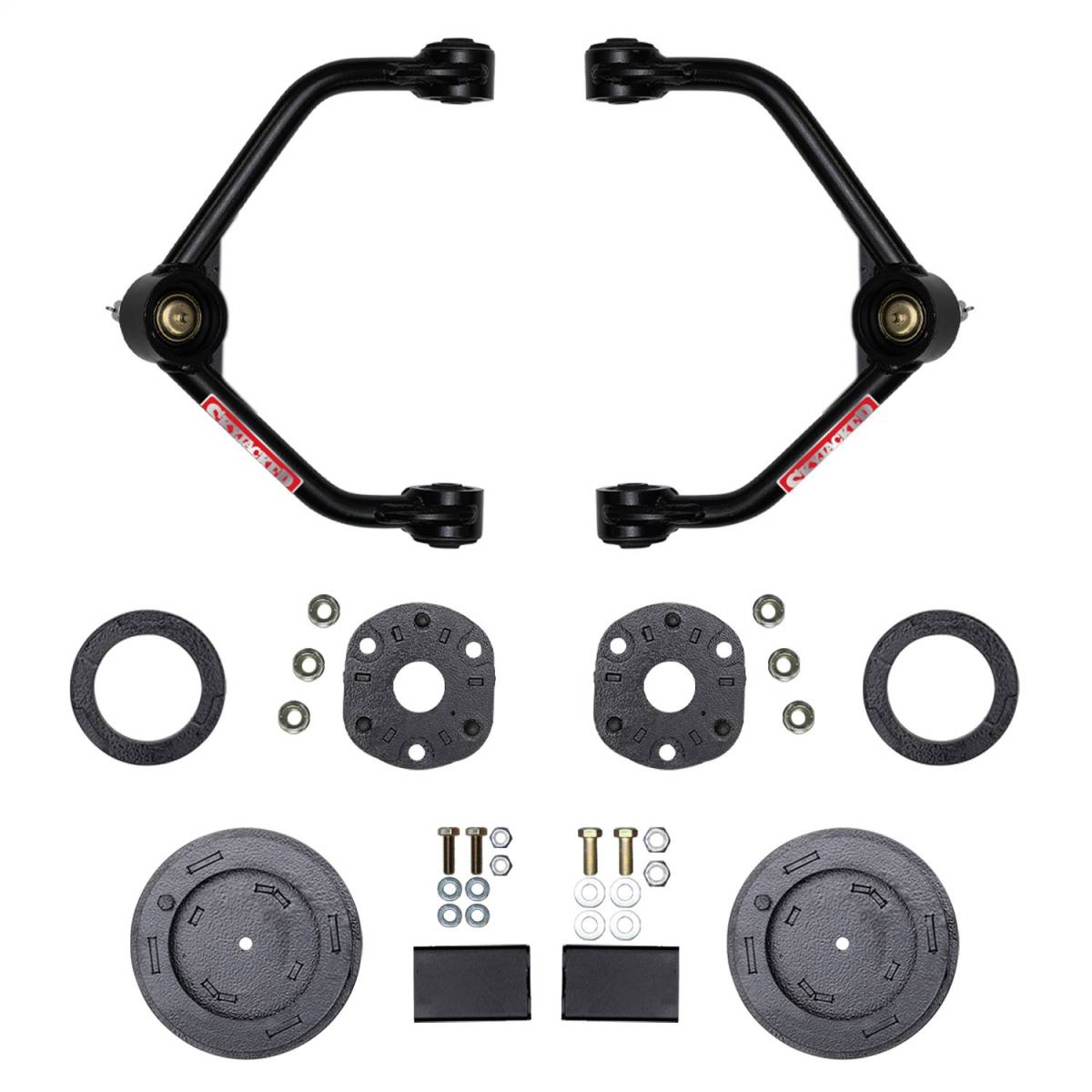 Skyjacker fabricated the Replacement Upper Control Arm (UCA) out of high weld strength, thick walled DOM steel tubing to withstand extreme amounts of stress and loads. For additional rigidity and strength, a welded gusset plate stiffens the arm and bushing eyelets into one. CNC machined bushing eyelets and ball joint cups ensure precise fitment. Skilled technicians assemble Skyjacker's exacting CNC laser cutting, bending and machining procedures to our calculated engineering specifications. The steel encased OEM style rubber bushings deliver a quiet consistent controlled stability and smooth riding comfort. The greasable ball joint's full induction ball design, low friction bearing technology and other technical performance characteristics add longevity and increased strength. Engineered with built-in camber correction for improved handling, this system integrates smoothly and functions perfectly allowing the CV axles to operate within limits of new UCA and OEM lower control arms. The replacement UCA comes completely preassembled and ready to install with a durable powder coat finish.Retain your front Ford OEM tuned performance struts with strut spacers. A combination of preload and short upper strut mount spacers distributes the lift load more evenly and prevents CV axle overextension within the OEM tolerances. The moderate front preload spacer, built from T6160 Aluminum, is the first component to add a higher ride height. A short 1-piece top mount metal strut spacer is the second piece. This 1-piece top mount strut spacer has a strong tab-and-slot interlocked design: precise CNC laser cut and precision formed in CNC press break. These are powder coated to provide an extremely durable protective barrier to prevent corrosion.This combination system functions perfectly to prevent binding of the new UCA with the strut assembly. Works with Electric Power Assisted Steering (EPAS) system. A 2-inch rear block and u-bolt kit delivers a more level stance.