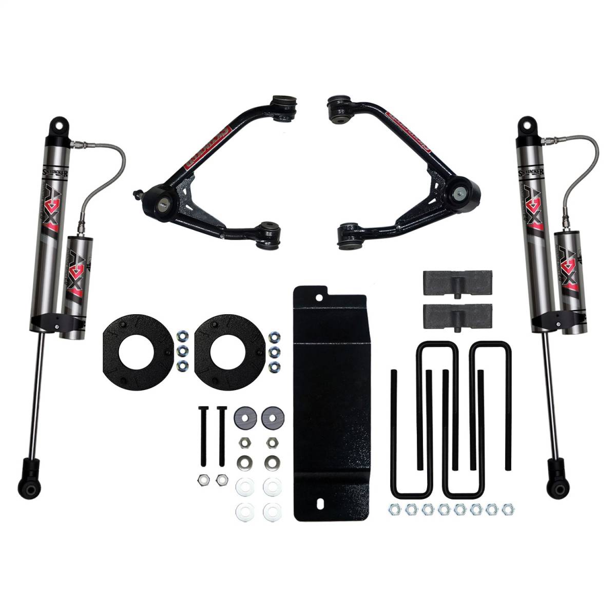 Raise your pickup's altitude to a bigger, bolder attitude. Raising the suspension to run 33-inch tires will add more ground clearance. Skyjacker's Replacement Upper Control Arm (UCA) kit goes beyond expectations to elevate your performance level.Skyjacker's replacement UCAs include built-in caster and camber correction for improved handling. A welded gusset plate stiffens the arm and bushing eyelets into one of rigidity and strength. CNC machined bushing eyelets and ball joint cups ensure precise fitment.The steel encased OEM style rubber bushings deliver a quiet consistent controlled stability and smooth riding comfort. The greasable ball joint's full induction ball design, low friction bearing technology adds longevity and increased strength. Comes preassembled and ready to install with a durable powder coat finish. Retain your front GM OEM tuned performance struts by utilizing 1-piece top mount strut spacers. This system functions perfectly allowing the CV axles to operate within limits of new UCA and OEM lower control arms. Retain your front GM OEM tuned performance struts by utilizing 1-piece top mount strut spacers. One-piece top mount strut spacers integrate smoothly with the factory suspension geometry. No need to disassemble OEM Struts for install. This system functions perfectly allowing the CV axles to operate within limits of new UCA and OEM lower control arms. Four (4) separate differential spacers securely reposition \ correct CV and driveshaft angles. A rugged replacement skid plate protects the differential.A 2-inch rear block and u-bolt kit delivers a more level stance. Complete with high-grade mounting hardware. Aligns to OEM factory specifications.Shocks are a key link in-between the chassis and the moving parts of your suspension. Skyjacker's ADX 2.0 Adventure Series Remote Reservoir Aluminum Monotube Rear Shocks deliver modern technology in the design with an innovative off-road race-inspired full-displaced valving system.