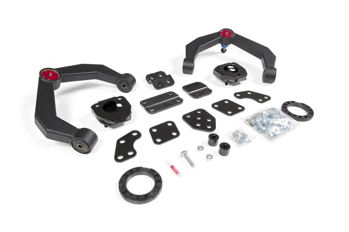 Zone Offroad 2.5" Adventure Series Upper Control Arm Lift System. The issue with most leveling kits for the late model Ram 1500s is limited travel. With any more than 1" of lift on stock components, the upper ball joint is maxed out before the suspension reaches full droop. Zone Offroad's new upper control arms correct the issue by repositioning the ball joint to work properly at 2-3" of lift while still allowing for a full range of motion. These new control arms dwarf the factory units and are built from 1/8" steel, boxed and fully welded with CNC-machined bushing and ball joint cups. They use OE durometer rubber bushings and greaseable OE-style heavy duty ball joints for quiet, reliable operation and superior corrosion resistance to uniball style control arms. These new fully boxed and welded control arms dwarf the factory arms and are built to take a beating offroad. Also included in this kit are a pair of pitched upper strut spacers and preload spacers to provide lift and reposition the factory strut for optimal performance. Finishing off this 2.5" Adventure Series kit is a complete 2" differential relocation kit to reposition the front axle to keep CV axle angles to a minimum. These components together offer impressive off-road performance out while maintaining highway drivability on the 2006-2011 Dodge Ram 1500 4WD trucks. The kit allows the clearance for 33-35" tires to be installed.