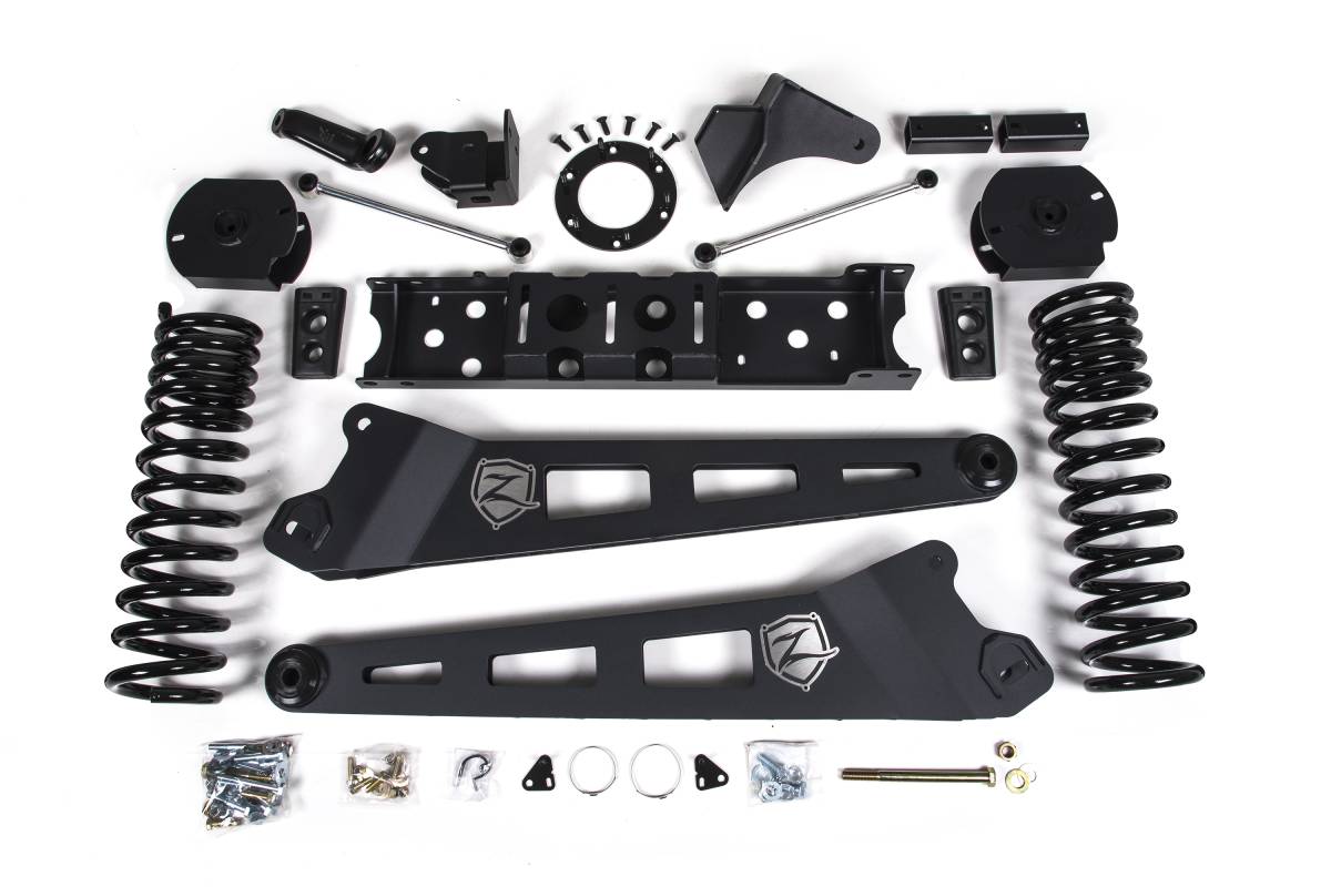 Up front, a pair of progressive rate, diesel-specific, 4.5" coil springs provides the extra height and smooth handling in the harshest of terrains. A forged drop pitman arm is supplied to correct steering angles. Polyurethane bump stops limit up-travel, while brake line relocation brackets will allow your suspension to easily reach "full droop". To correct the front suspension geometry at the new height, a pair of heavy-duty replacement radius arms is provided that bolt directly into the factory location. These new arms are massive upgrade to the factory stamped units, built from 1/4" American made steel, and internally gusseted with a lower cam adjustment to dial in front end caster. A heavy-duty replacement transmission crossmember as well as a transfer case indexing ring repositions the front driveline output to allow use of the factory drivelines by correcting angles and allowing you to maintain use of 4WD. In the rear, 2.5" heavy-duty coil spacers are supplied to level out the stance and allow you to retain factory ride quality without effecting tow capacity. Extended rear sway bar end links and new bump stops are included to compensate for the lift, and a track bar bracket re-centers the rear axle.