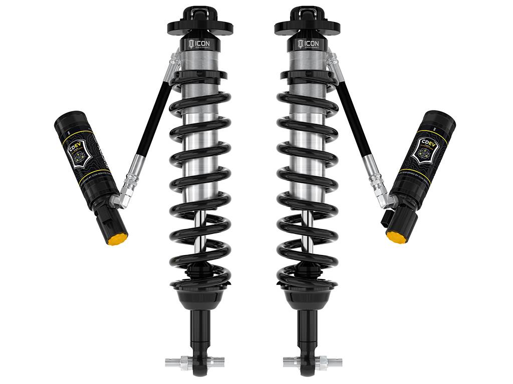 ICON Vehicle Dynamics V.S. 2.5 Series remote reservoir front coilover shocks with CDEV are the ideal upgrade for the front end of the 2021-UP Ford Bronco. These adjustable coilovers allow up to 3-4” of lift height adjustability on Broncos without the Sasquatch package or 2-3” of lift over stock Sasquatch equipped Broncos, allowing the use of larger, more aggressive wheel and tire combinations. ICON’s Vehicle-specific shock length and valving along with the larger 2.5” shock body and increased piston area over stock components yield the maximum travel possible along with superior ride quality and suspension performance both on- and off-road. Reservoirs greatly increase shock oil volume and heat dissipation surface area to resist overheating and cavitation under hard use, which can lead to damper fade. ICON's exclusive Compression Damping Electronic Valves (CDEV) are included to allow for lightning fast, precise electronic shock tuning, on-the-fly, at any speed and in any terrain. Focus on driving and let ICON Intelligent Control (IIC) read the terrain and make near-instant adjustments via the CDEV at each individual shock. Control the system wirelessly through the IIC app on your phone and once configured the system functions without driver input. ICON 2.5 Series rear coilovers with CDEV and matching IIC module are required for installation but vehicle control will be actively balanced front to rear, resulting in the best overall driving experience for your Ford Bronco.