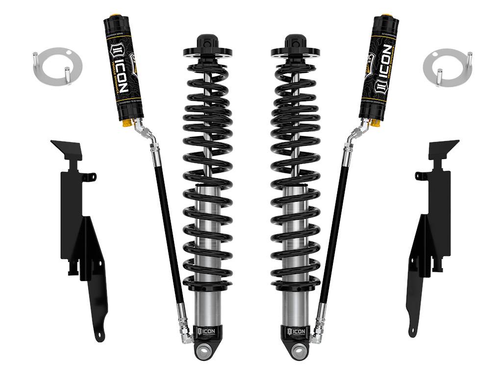 ICON Vehicle Dynamics V.S. 2.5 Series remote reservoir rear coilover shocks with CDCV are an incredible upgrade for the rear end of the 2021-UP Ford Bronco. These adjustable coilovers allow up to 2-3” of rear lift height adjustability on 4-door Broncos without the Sasquatch package or 1.25-2.25” of rear lift over stock 4-door Sasquatch equipped Broncos, allowing the use of larger, more aggressive wheel and tire combinations. ICON’s Vehicle-specific shock length and valving along with the larger 2.5” shock body and increased piston area over stock components yield the maximum travel possible along with superior ride quality and suspension performance both on- and off-road. Reservoirs greatly increase shock oil volume and heat dissipation surface area to resist overheating and cavitation under hard use, which can lead to damper fade. ICON's exclusive Compression Damping Control Valves are included for precisely dialing in your suspension performance. CDCV controls fluid flow under compression, allowing you to achieve the perfect tune whether driving on the street, slow-crawling through the rocks or mobbing across the desert at full throttle. These rear coilovers are mounted in a shaft up orientation and feature unique ICON engineered progressive triple rate coil springs, allowing for softer spring rate at ride height that ramps up as the coil compresses for improved bottom out resistance. This shaft up orientation also requires the reservoir hose to be routed along the rear lower links so ICON offers hose bracket options for the OE or ICON tubular links while ICON billet links incorporate this bracketry into their design. When paired with ICON 2.5 Series front coilovers vehicle control will be balanced front to rear, resulting in the best overall driving experience for your Ford Bronco.