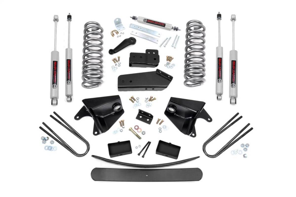 Give your Ford an aggressive look from front to rear with Rough Countrys 6 in. Ford Suspension Lift Kit! This easy-to-install leveling kit raises the front of your vehicle to be equal height with the rear for a leveled, flush look that gives a better ride height and more aggressive appearance. This kit features a set of front, durable coil springs allowing you gain additional ride height without sacrificing ride quality or performance. A set of radius arm and axle drop brackets are provided to keep everything at optimum angles for a factory-like ride, even after lifting. Our fabricated rear blocks offer considerably more strength than their cast iron counterparts. A set of Rough Countrys premium N3 shocks are also included in this kit. These fine tuned 10-stage variable high-pressure Nitrogen charged shocks offer a fantastic blend of off-road action and smooth highway ride quality. With a durable 18mm spring-loaded piston rod and faster-cooling 54mm shock body. Get the wheels you want! Rough Countrys 6 in. Ford Suspension Lift Kit comes with everything you need to fit up to a 35 in. tire with proper wheel backspacing. Best of all, Rough Countrys 6 in. Ford Suspension Lift Kit is backed by our Lifetime Replacement Warranty.