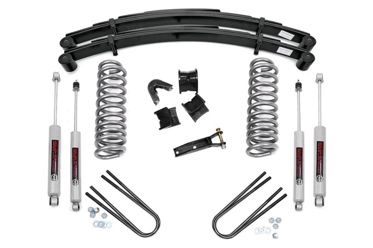 Give your 78-79 Ford Bronco an aggressive look from front to rear with Rough Countrys 4 in. Ford Suspension Lift Kit! This easy-to-install leveling kit raises the front of your vehicle to be equal height with the rear for a leveled, flush look that gives a better ride height and more aggressive appearance. This kit features a set of front, durable coil springs and rear leaf springs allowing you gain additional ride height without sacrificing ride quality or performance. A set of 7 degree c-bushings and track bar drop bracket are provided to keep everything at optimum angles for a factory-like ride, even after lifting. Our fabricated rear blocks offer considerably more strength than their cast iron counterparts. A set of Rough Countrys premium N3 shocks are also included in this kit. These fine tuned 10-stage variable high-pressure Nitrogen charged shocks offer a fantastic blend of off-road action and smooth highway ride quality. With a durable 18mm spring-loaded piston rod and faster-cooling 54mm shock body. Get the wheels you want! Rough Countrys 4 in. Ford Suspension Lift Kit comes with everything you need to fit up to a 35 in. tire with proper wheel backspacing. Best of all, Rough Countrys 4 in. Ford Suspension Lift Kit is backed by our Lifetime Replacement Warranty.