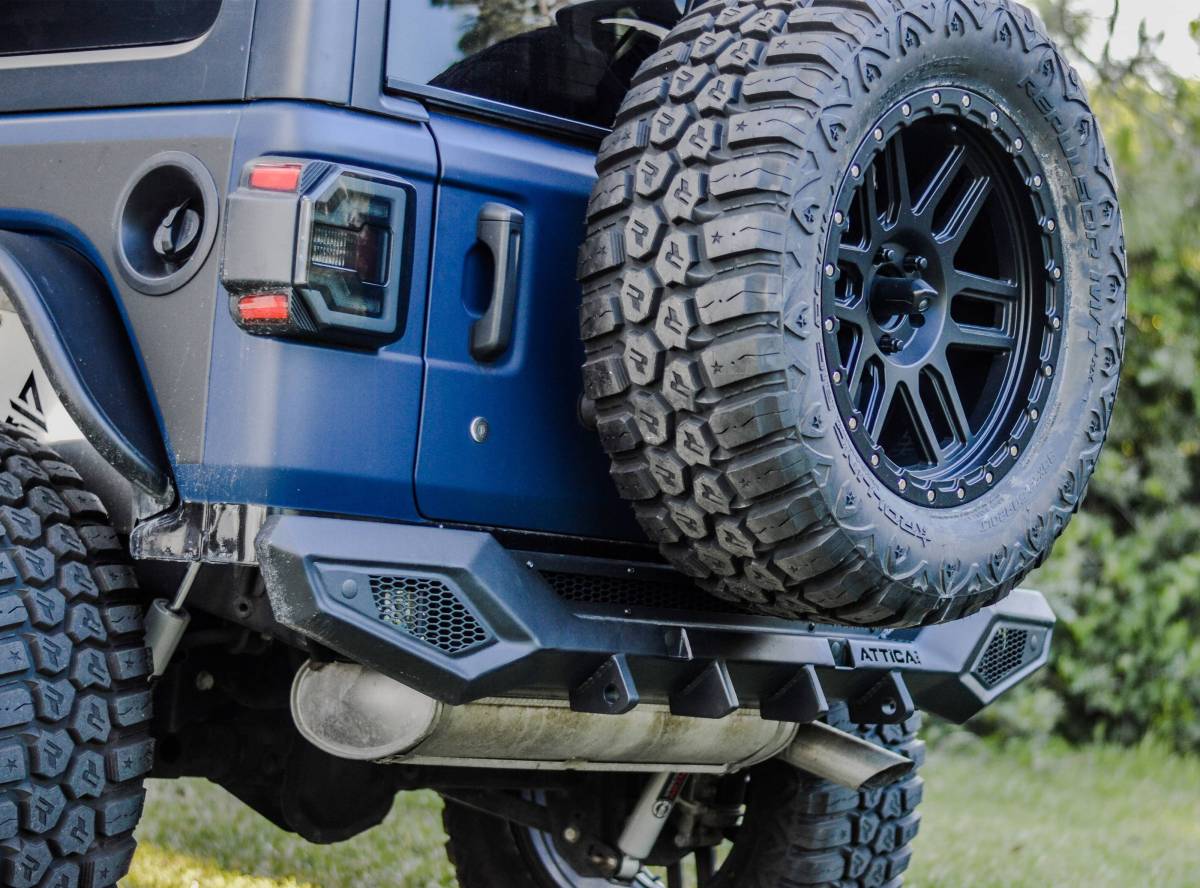 2018-2023 Jeep Wrangler JL Rear Bumper - Black - Powder Coated - SteelYour One-Stop Shop for 4x4 Adventure: Explore our extensive collection of off-road accessories, parts, and gear at Attica4x4.com Conquer the Trails in Style: Discover our wide range of stylish and durable fender flares, bumpers, and roof racks designed for off-road enthusiasts. Enhance Your Off-Roading Experience: Find top-notch LED headlights, skid plates, and protective accessories to tackle any terrain with confidence. Customize Your Off-Road Companion: Explore our collection of Jeep parts and accessories to personalize your 4x4 vehicle to your unique style and needs. Experience Unmatched Quality: We manufactuer our products to the highest quality to ensure durability, reliability, and superior performance on your off-road journeys.